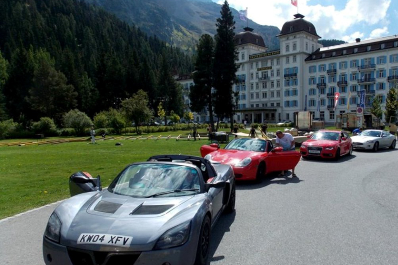 The event is a 2000-mile, 7-day road tour that starts at Ashford, then travels to Calais, through France and Switzerland to Lake Lucerne, before driving through the Swiss Alps via the Grimsel Pass, the Furka Pass, the St Gotthard Pass, the San Bernardino Pass and the Julier Pass, before arriving in St Moritz.
